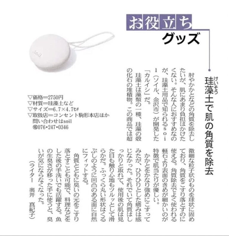 2023年に発売された soilカルイシが、日本経済新聞 2023年8月19日号に掲載されました。 キメが細かいので保湿をしながら角質ケアも出来る、デイリーユースの軽石です。 すり洗いをすることによって、調理後の手につい