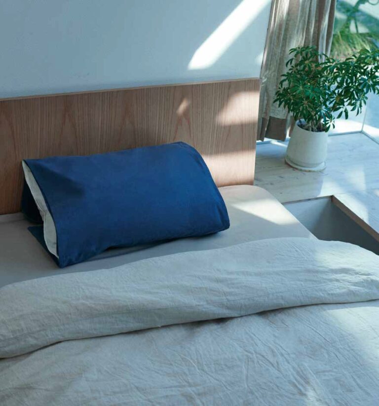 「soil PILLOW COVER」(soilピローカバー 税込定価 7700円) このピローカバーは、昨年発売した「ピローパッド」と違い、今お使いの枕に掛けて、背面についている二本の紐で結び、ご使用になれるように致し
